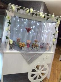 Candy cart is dressed to match your theme, wooden construction with twinkling light back drop, glass vases for sweets and paper bags supplied for guests.