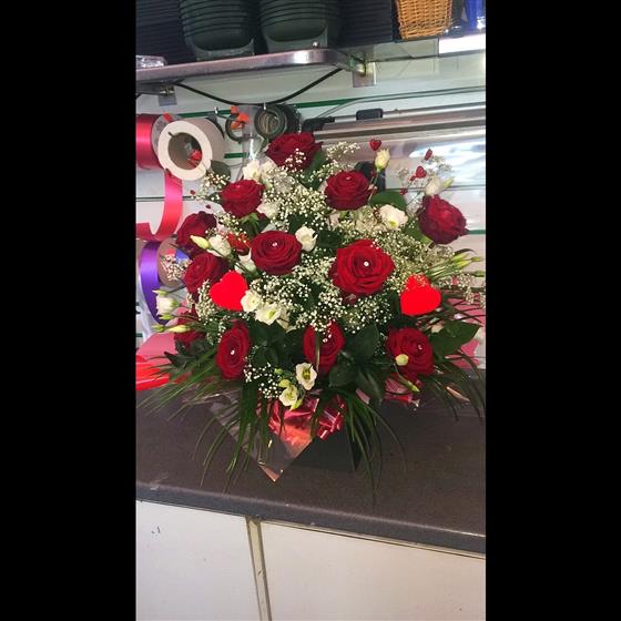 Luxurious and elegant Tallbox style bouquet, 12 stems of velvety grand prix roses combined with salal, hard ruscus, palm leaves and complimented with lisianthus and a touches of gypsophila, perfect for your valentine