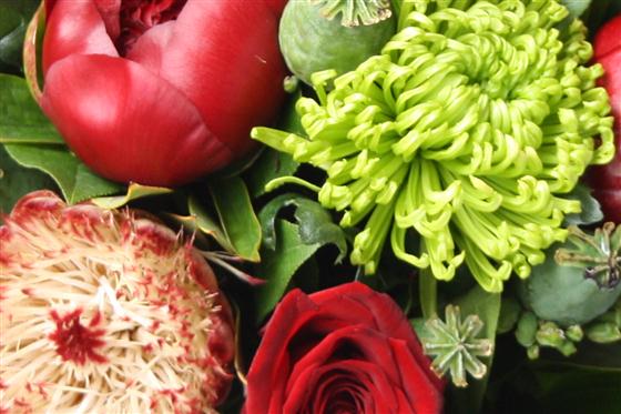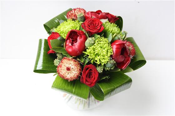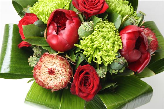 An exotic collection of red and lime blooms including proteas, roses, poppy heads and shamrock blooms.