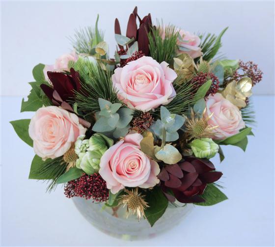 A muted deep red and pastel pink Christmas hand-tied bouquet including six long stemmed pink roses and gold highlights.