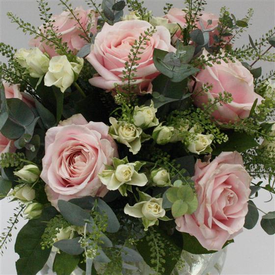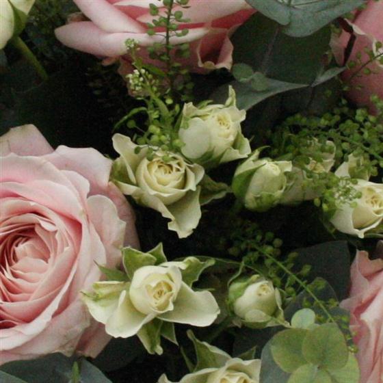 A multi textured bouquet of baby pink roses, cream spray roses and wispy foliage.