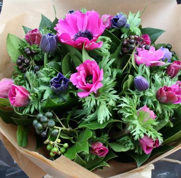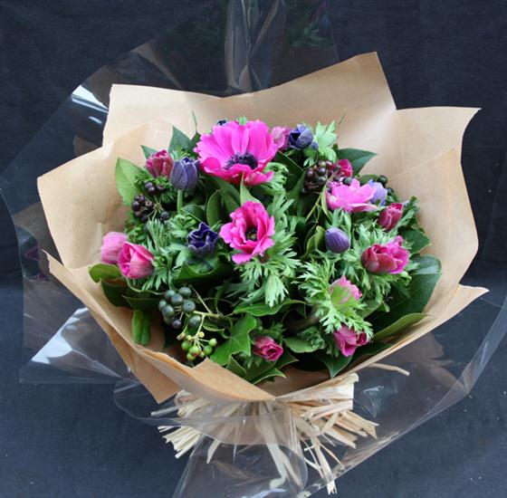 A sweet bouquet of anemones, scented hyacinth, tulips and mixed seasonal foliage.