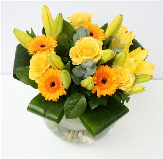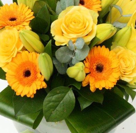 Golden lilies, roses and gerberas combine to create this vibrant bouquet. image displayed is of a medium