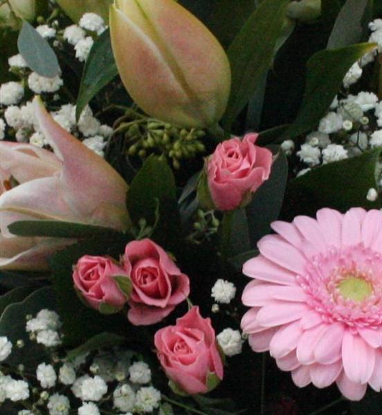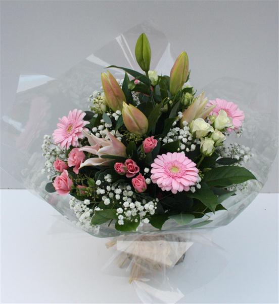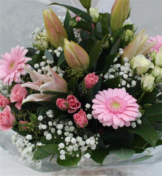 A sweet selection of pastel pinks and creams including lilies, roses and gerberas. One of our most popular bouquets.